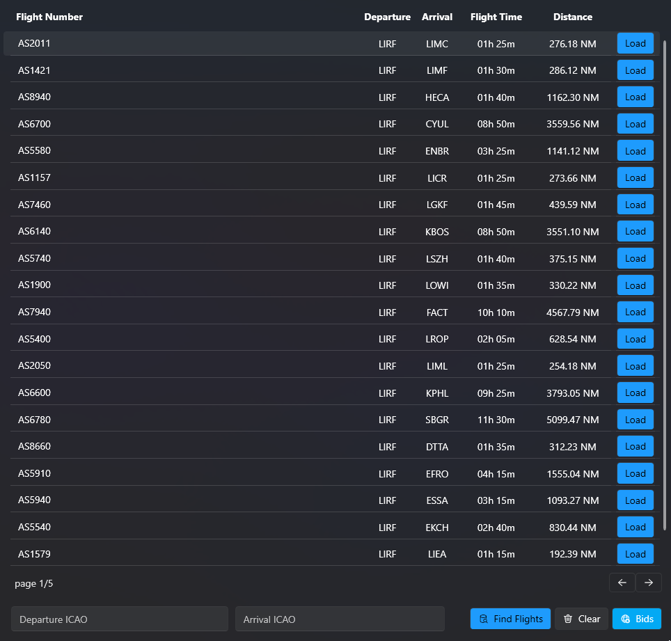 Nella pagina Flight Search appena aperta vedrai come prima cosa tutti i voli schedulati presenti in Aerosachs. Vedrai solo i voli presenti dall'aeroporto nel quale ti trovi al momento. Una volta trovato un volo che ti piace ti basterà premere il tasto Load e automaticamente l'ACARS ti popolerà la pagina New Flight con alcuni dati. Completa quelli mancanti e decolla.