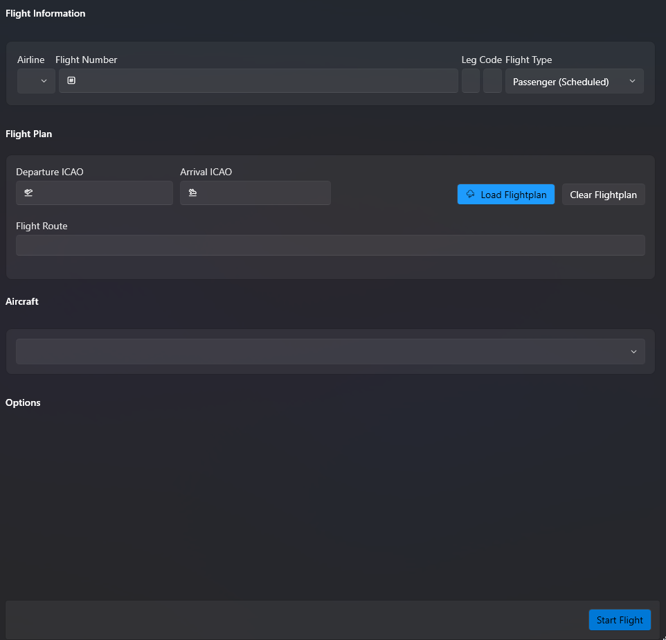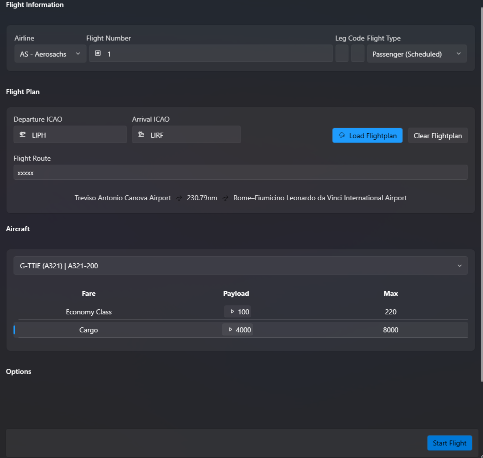 NellaQuesta pagina Newรจ Flightdisabilitata. potraiPer creartiavviare un volo liberoapri direttamentela dall'ACARS. Come sul sito compila tutti i dati e successivamente una volta pronto, premi il tastopagina "StartFlight Flight"Search". Una volta selezionato l'aereo ti si apriranno ulteriori voci dove inserire i dati su passeggeri e cargo che andrai a portare.