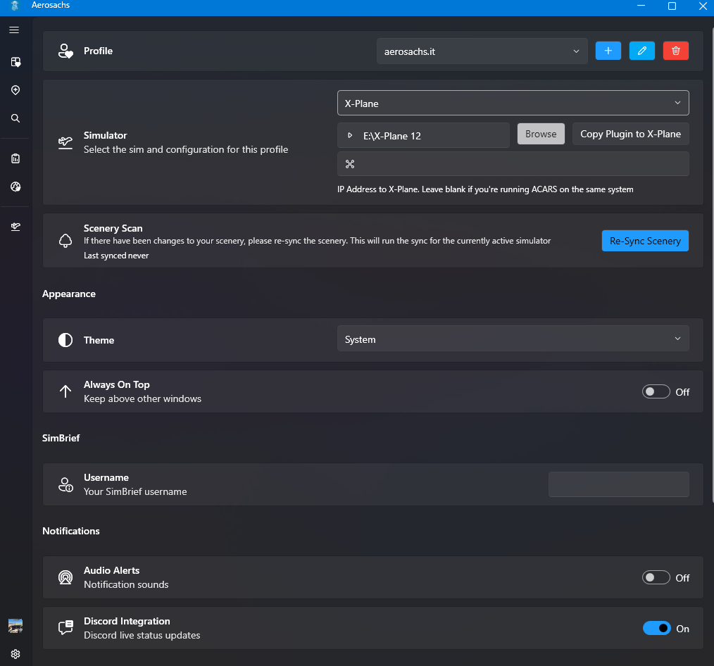 • La sezione Notifiche, dove è possibile attivare o disattivare le notifiche sonore e l'integrazione con Discord, che farà in modo che nel vostro account Discord, se attiva, si veda come gioco in uso al momento l'ACARS
