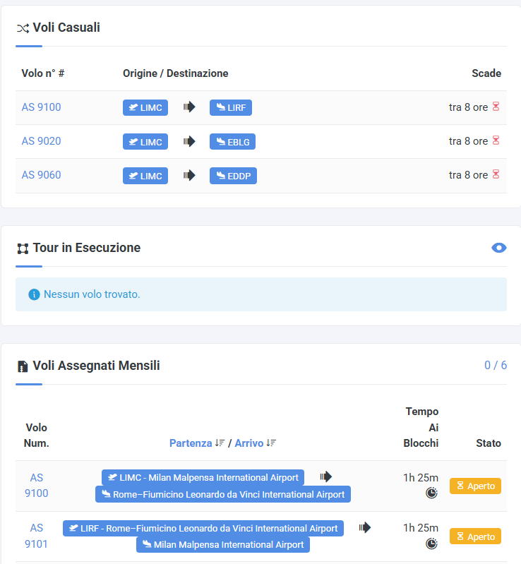 Inoltre potrai trovare i voli casuali, che sono voli scelti in maniera randomica dal sistema dall'aeroporto nel quale ti trovi, i tuoi tour in corso e infine un recap delle tue assegnazioni.