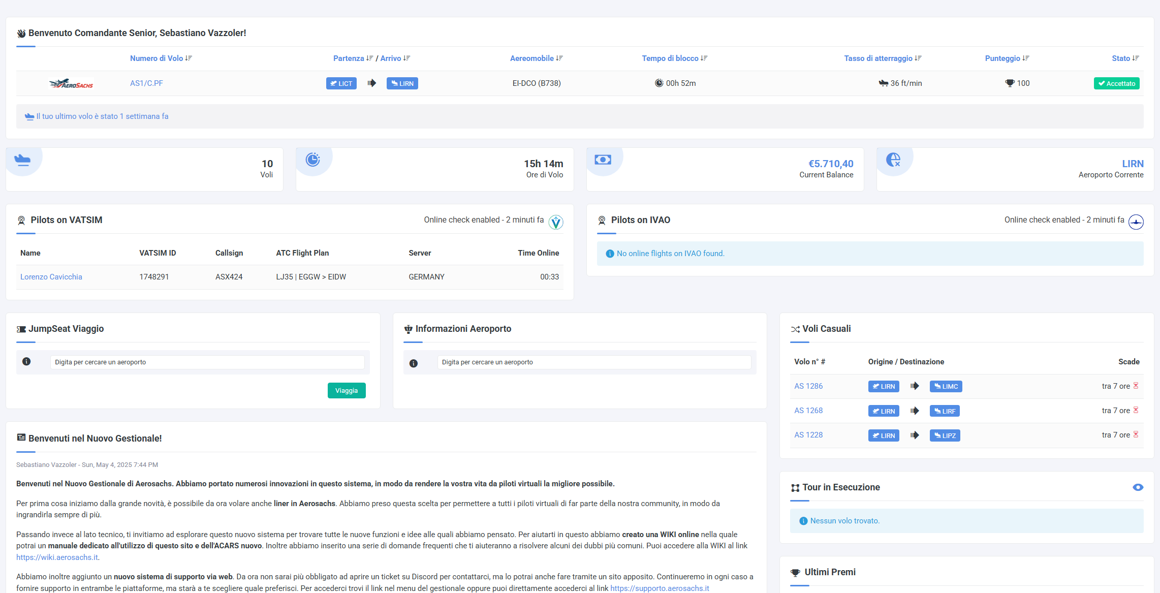 Nella Dashboard potrai trovare numerose informazioni importanti, sia riguardo il tuo account che in generale riguardo la compagnia. Partendo dall'alto troverai il tuo ultimo pirep e alcune tue statistiche. Proseguendo potrai vedere tutti i piloti di Aerosachs al momento online in entrambi i network.
