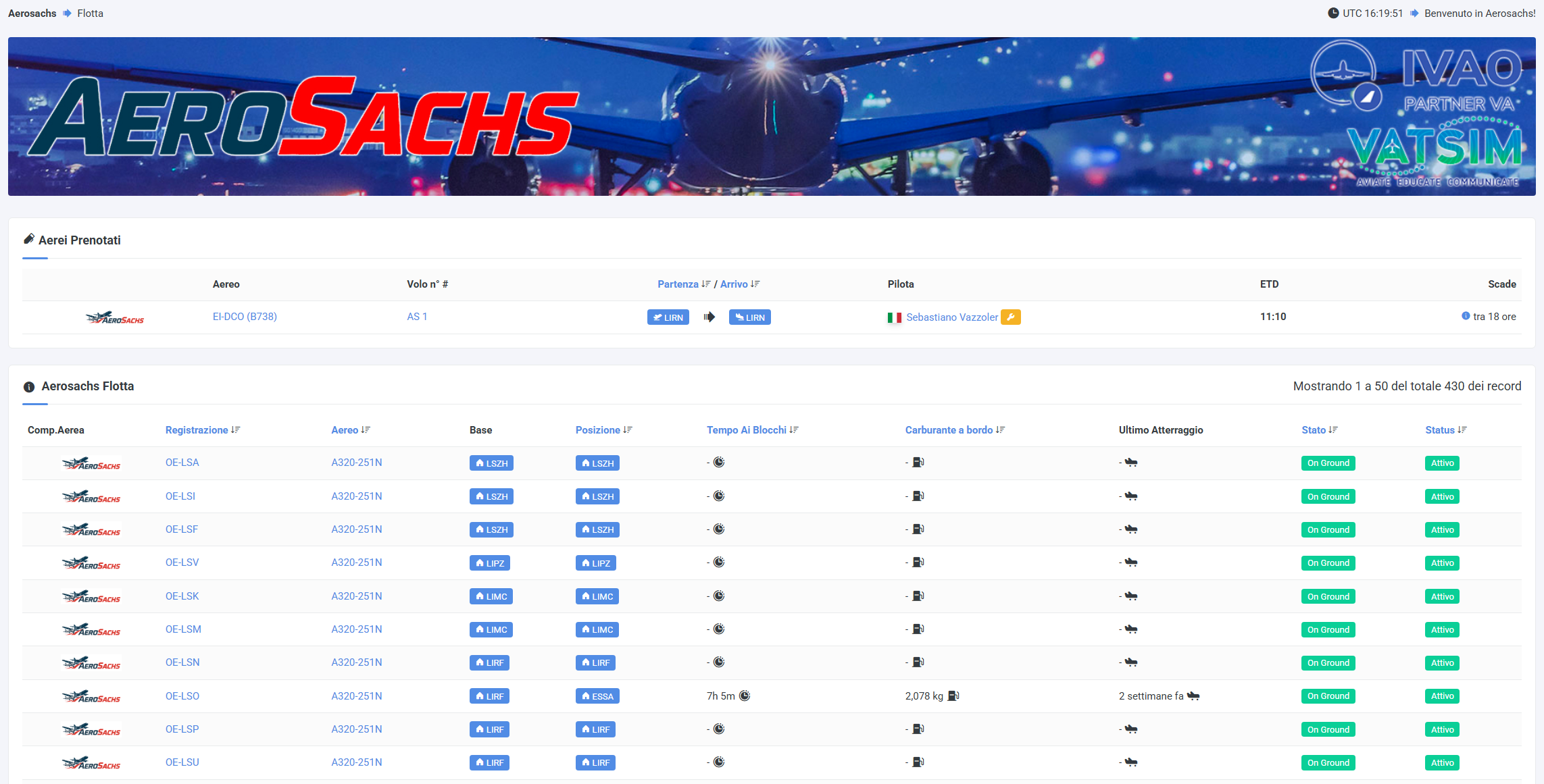 Una volta aperta questa pagina per prima cosa vedrai tutti gli aerei al momento prenotati. Nella seconda tabella invece potrai vedere tutti gli aerei presenti in Aerosachs. Attenzione, vedrai solamente gli aerei che potrai volare con il tuo grado, quindi avanzando man mano di grado compariranno nuovi aerei all'interno di questa tabella.