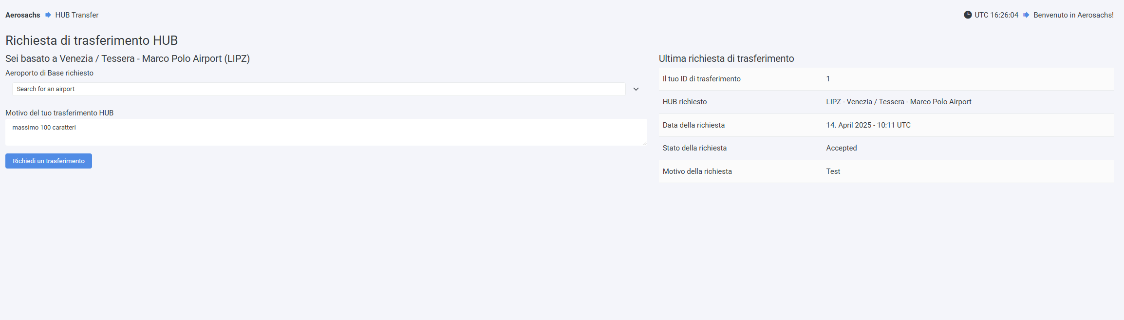 In questa pagina potrai fare richiesta di trasferimento di Hub. Ci sono varie motivazioni per farlo, ma principalmente cambiare base vi permetterà di variare il network nei voli assegnati. Inviare una richiesta è gratuito e una volta inviata un membro dello staff dovrà approvartela.