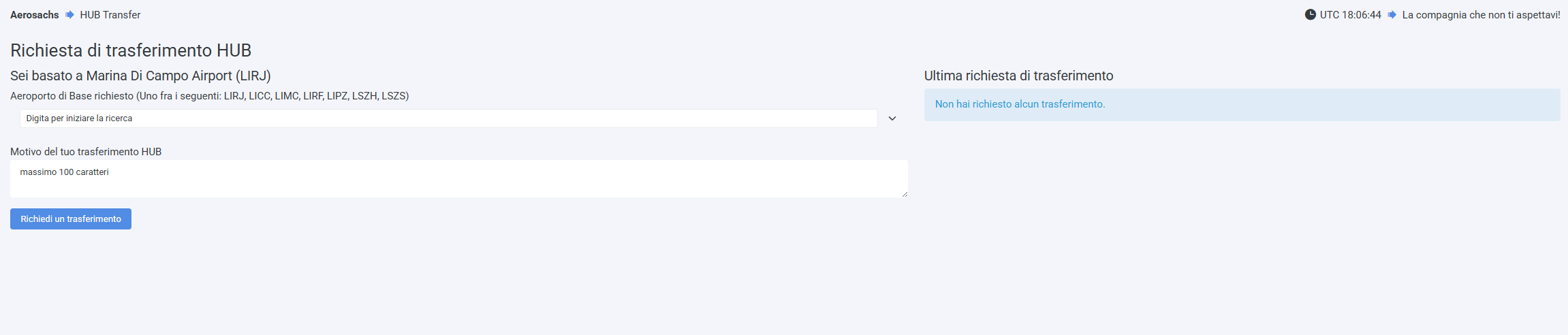 In questa pagina potrai fare richiesta di trasferimento di Hub. Ci sono varie motivazioni per farlo, ma principalmente per variare il tuo network nei voli assegnati. Inviare una richiesta è gratuito e una volta inviata un membro dello staff dovrà approvartela.