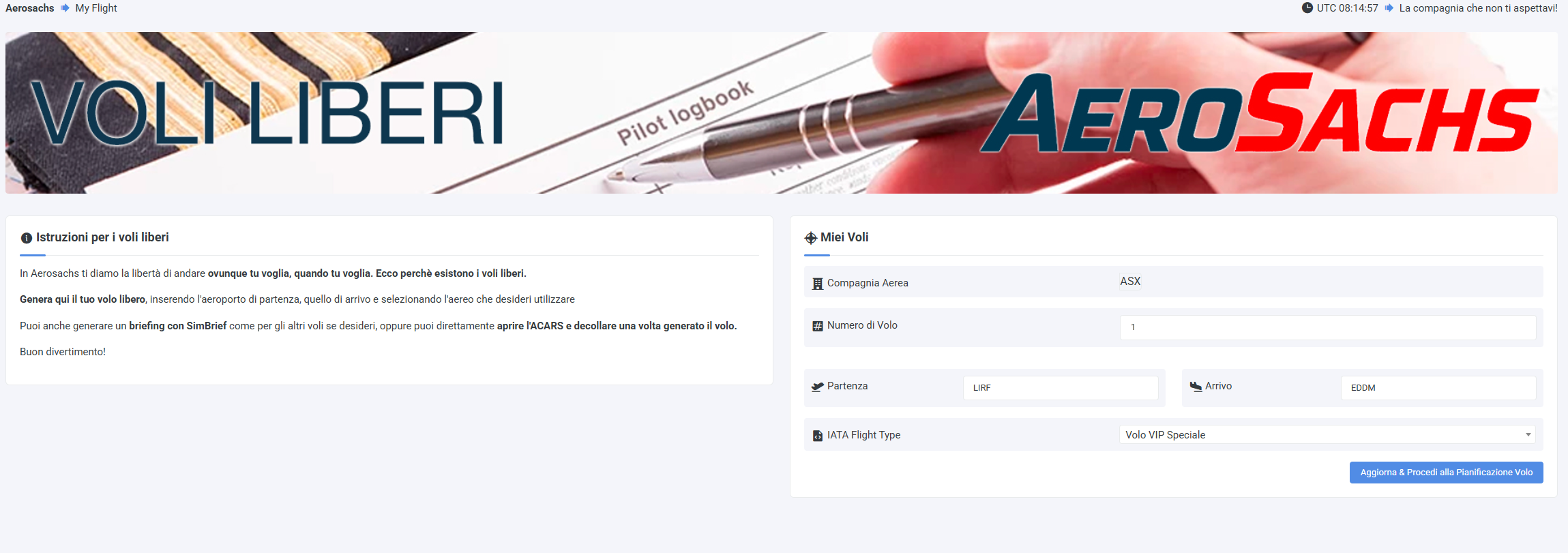 Per generare un volo libero bisogna compilare questo piccolo form. L'unico dato di questo form che dovete compilare è l'aeroporto di arrivo. Il resto ve lo ritroverete già compilato. Nel caso il sistema vi dia un errore dopo aver inserito l'aeroporto di arrivo contattaci su Discord tramite ticket per permetterci di aggiungerlo manualmente. Una volta compilato il form premete il pulsante "Aggiorna e procedi alla pianificazione del volo". A questo punto vi si aprirà una nuova pagina: